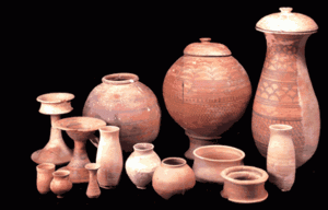 Various objects d’art found at Moenjodaro include burnt clay male and female figurines, and models of bird, a steatite bust a noble man or a priest-king, wearing a loose robe on which the trefoil pattern is engraved and a small dancing girl of bronze with slim figures and flat negroid features. Steatite seals bearing lifelike representation of animals and mythological creatures such as the unicorn best illustrate the figural. They bear short inscription in a remarkable pictographic script, which has yet to be deciphered.
