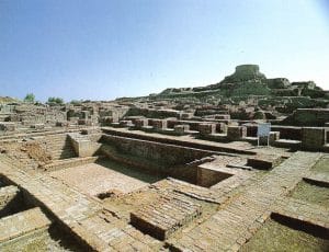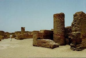 The ruins of the huge city of Moenjodaro – built entirely of unbaked brick in the 3rd millennium BC are set on high embankments, the ramparts, and the lower town, which is laid out according to strict rules, provide evidence of an early system of town planning.